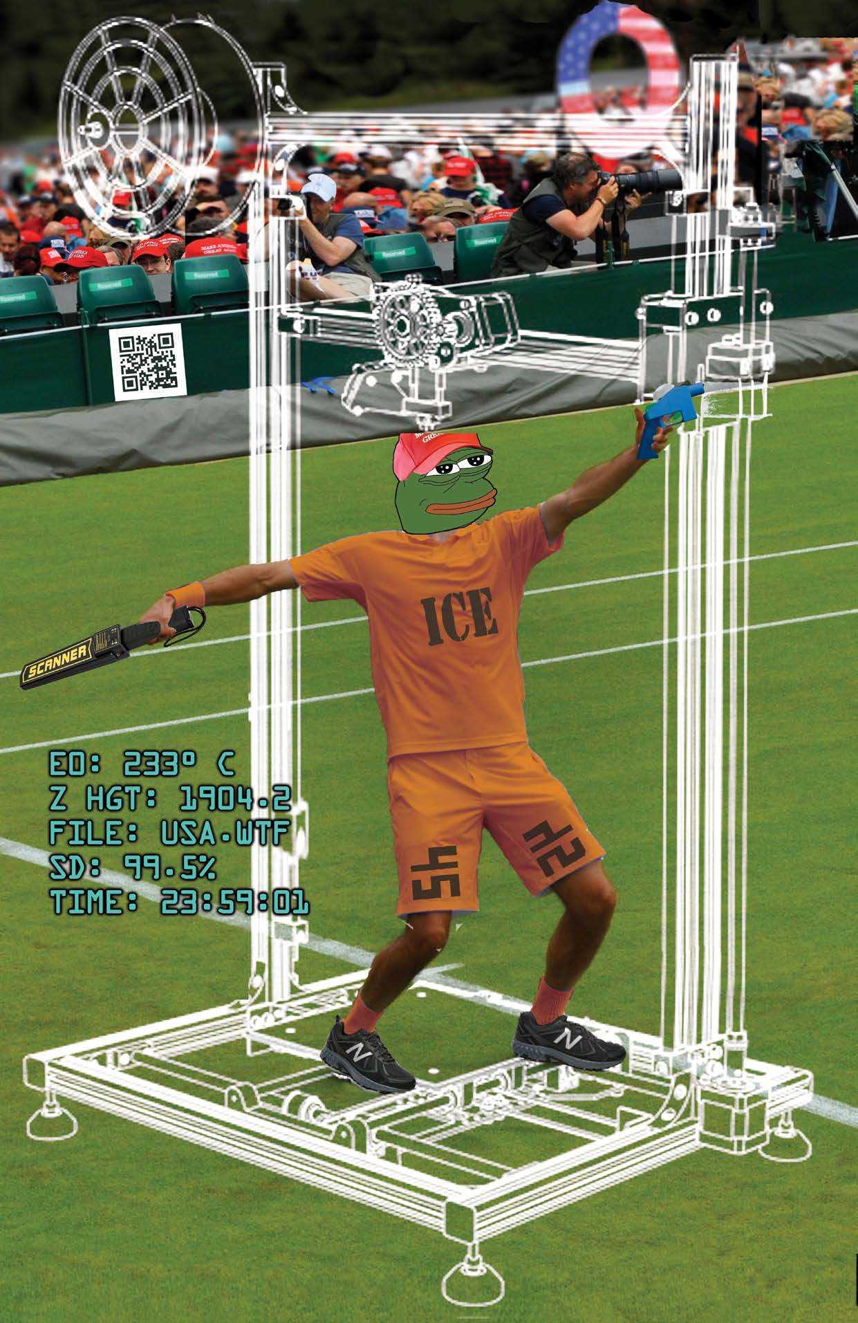 We see the face of Pepe the Frog (who had for some reason been adopted by various pro-freedom movements) being printed onto a figure wearing orange jumpsuit tennis clothing with the initials "ICE" on the shirt and "45" on the pants with a full-on swastika effect. (If you look carefully, you can see some other Pepes in the crowd.)