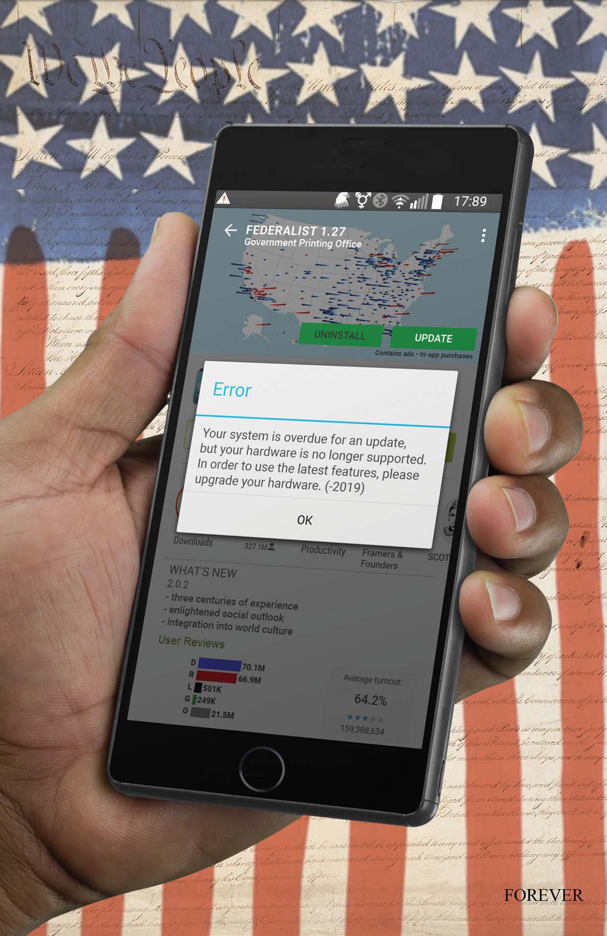A smartphone (Android in style yet with an iPhone button) is being held against the backdrop of the Constitution printed on an American flag.