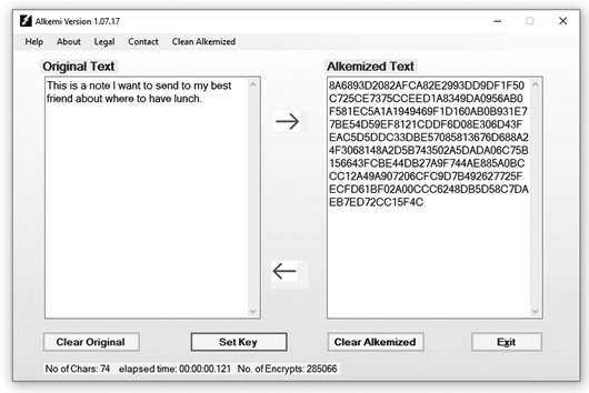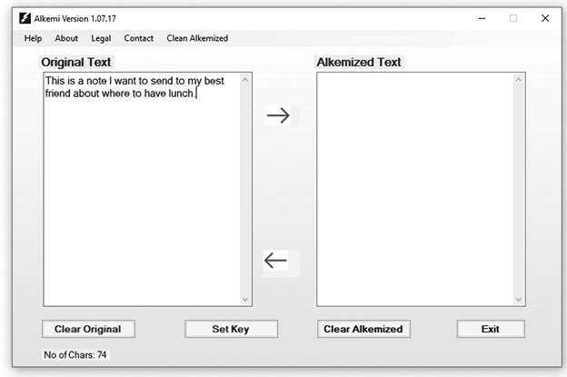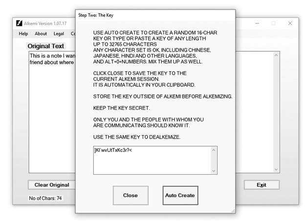 I think I've made ALKEMI easy to use. When you encrypt (or decrypt), the data is also placed in your clipboard so you can, in two steps, encrypt and paste into a communication program. The same with the key. When you create the key, it is also placed in your clipboard as soon as you close the dialog box so it's easy to save (like with Notepad or Notepad++) and communicate it to your friends.