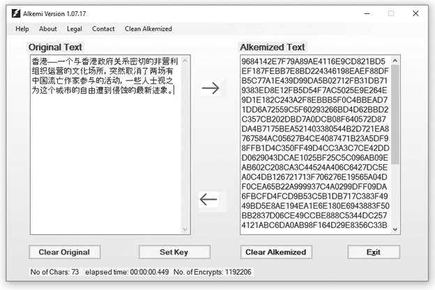 byte[] b = new byte[sizeofRandomData]; new RNGCryptoServiceProvider().GetNonZeroBytes(b);Since the Microsoft TextBox control supports a large number of character sets, ALKEMI can encrypt Chinese and other languages the same way: