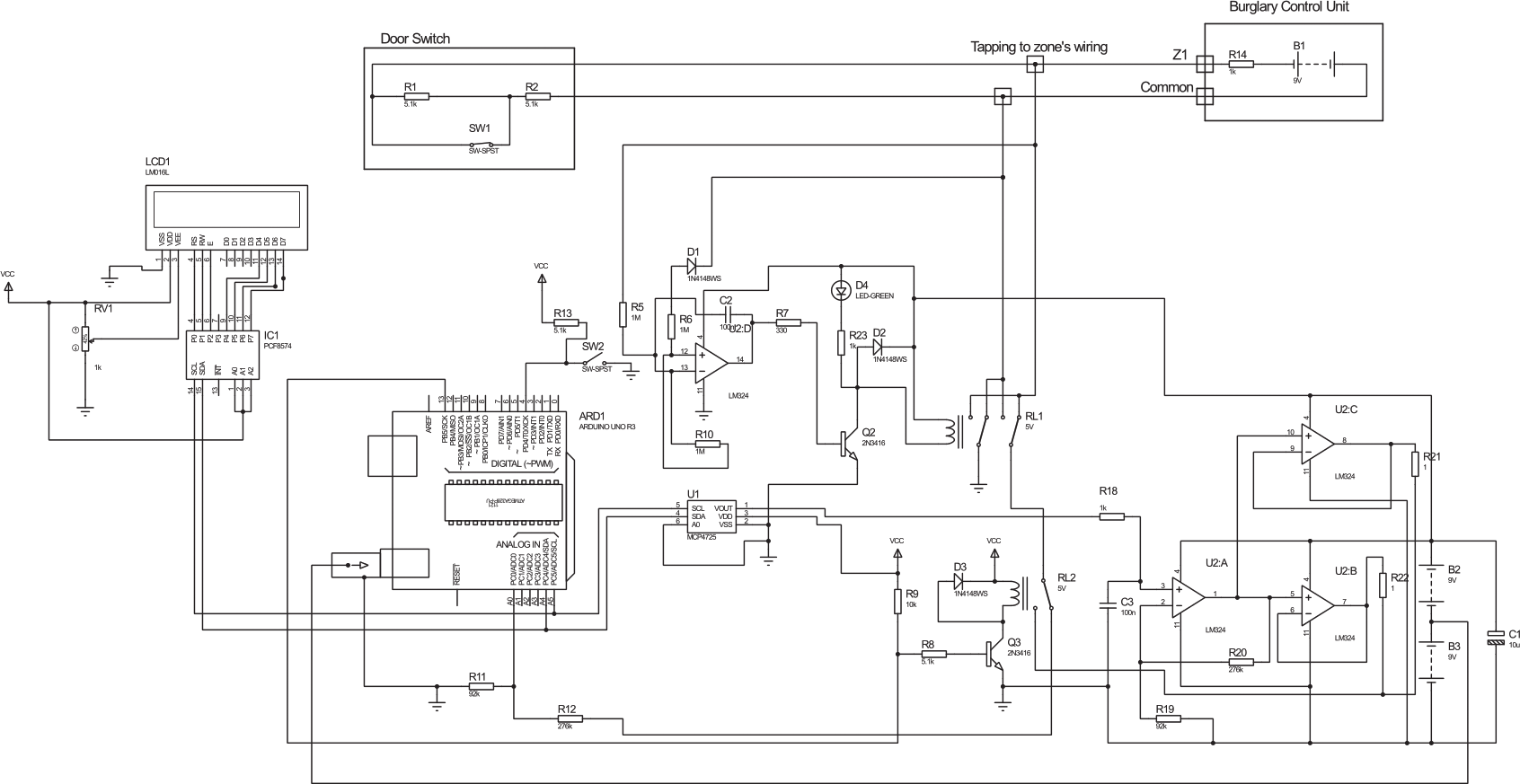 The LCD1 display will print the measured voltage level of a zone loop. It receives measure data through the I2C's communication from the Arduino Uno microcontroller. This sub-circuit may be omitted, however. Wait a few seconds allowing measuring of the zone loop voltage level before switching to attack mode. The voltage input/output divider (R11 / R11 + R12) was set for ratio 1:4 for AD input voltage level requirements.