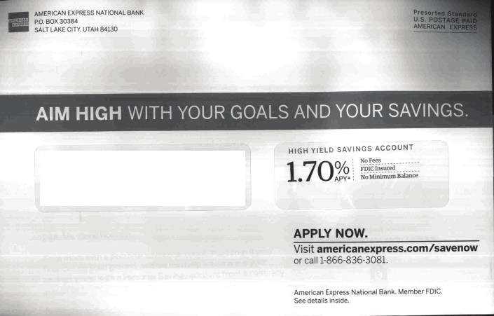 Based on this envelope, an advertisement for high-yield savings accounts, American Express thinks they have some money to place in savings - and be willing to bank online.