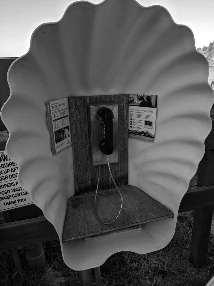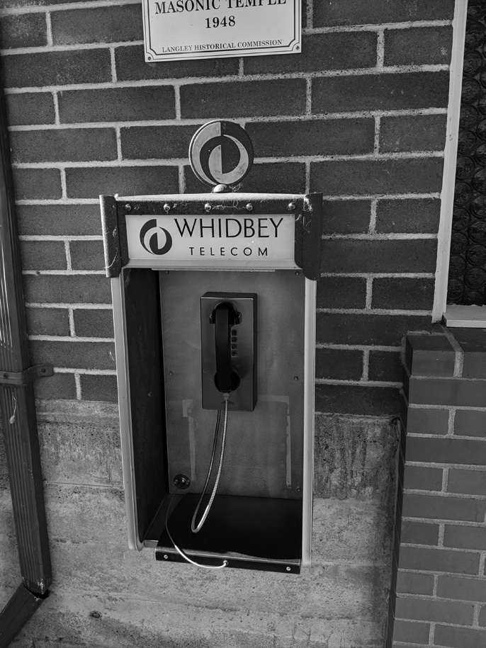 Later that day I found yet another freephone at the Langley docks. This one, although denuded of a phone book, enjoyed an appropriate seashell halo. These and numerous other phones are the property of the island's own Whidbey Telecom. In total, Whidbey Telecom reports that there are 34 such freephones. According to an article from 2012, WT decided to repurpose many of the payphones into free phones for local calls.