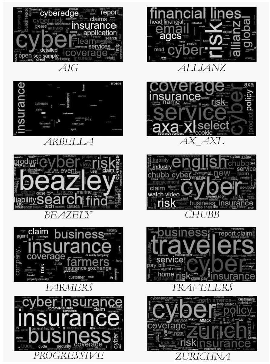 Figure 3: Word clouds describing the frequency of words, as they appear on each of the top ten cyberinsurance providers' landing pages.These results can correlate to the word maps for both companies, which can be seen in Figure 3. AIG's word cloud has notable examples of buzzwords, such as "cyberedge," while Allianz's word cloud seemingly lacks any such vernacular, instead including such neutral terms as "financial," "risk," and "underwriter."