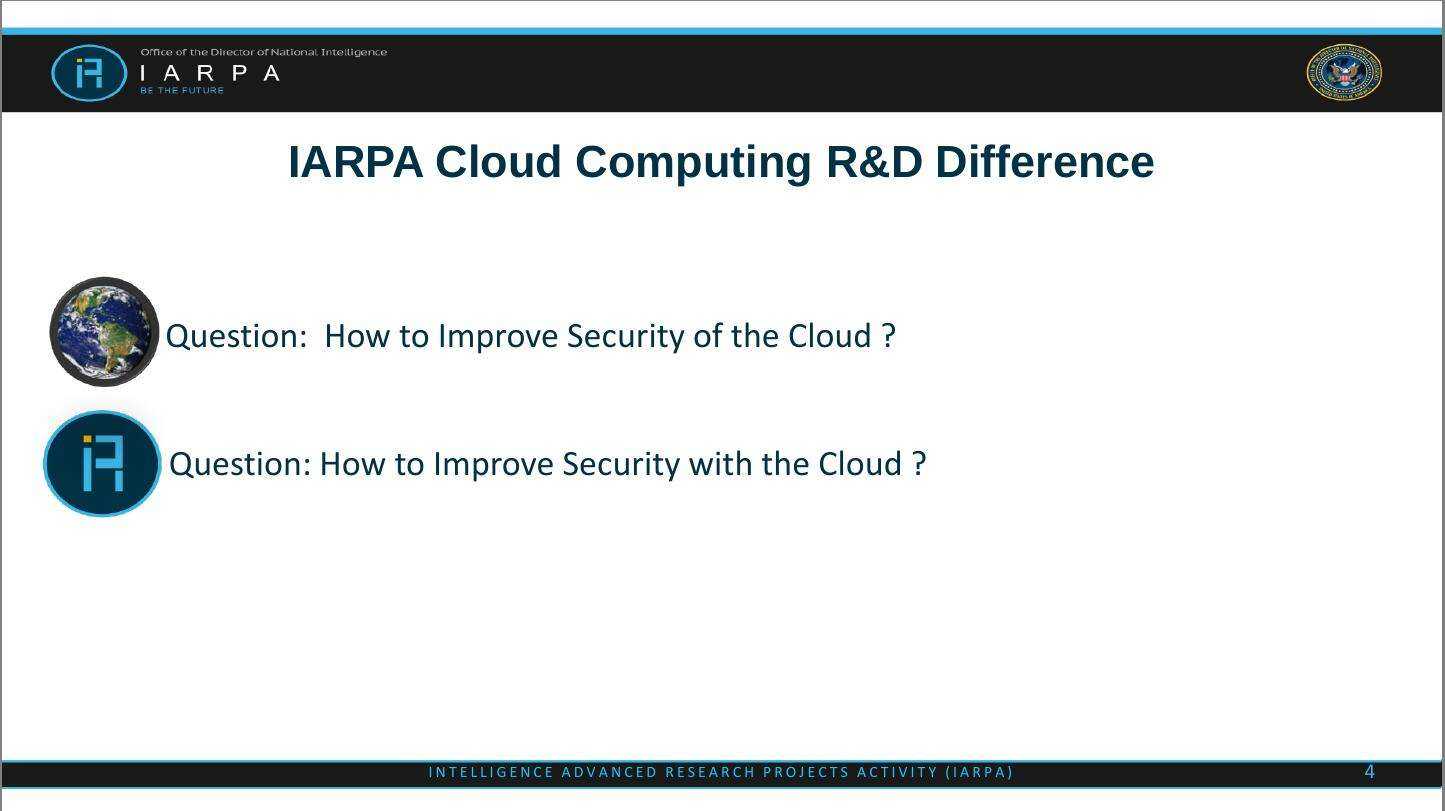 Additionally, Intelligence Advanced Research Projects Activity (IARPA) from DNI's Office also tries to convince the public about the cloud security problem. Its explanation mainly illustrates a question "How to Improve Security with the Cloud?" More interestingly, they proposed a concept "Defining Protection Benefits/Costs as a Function of Time" in the slides.