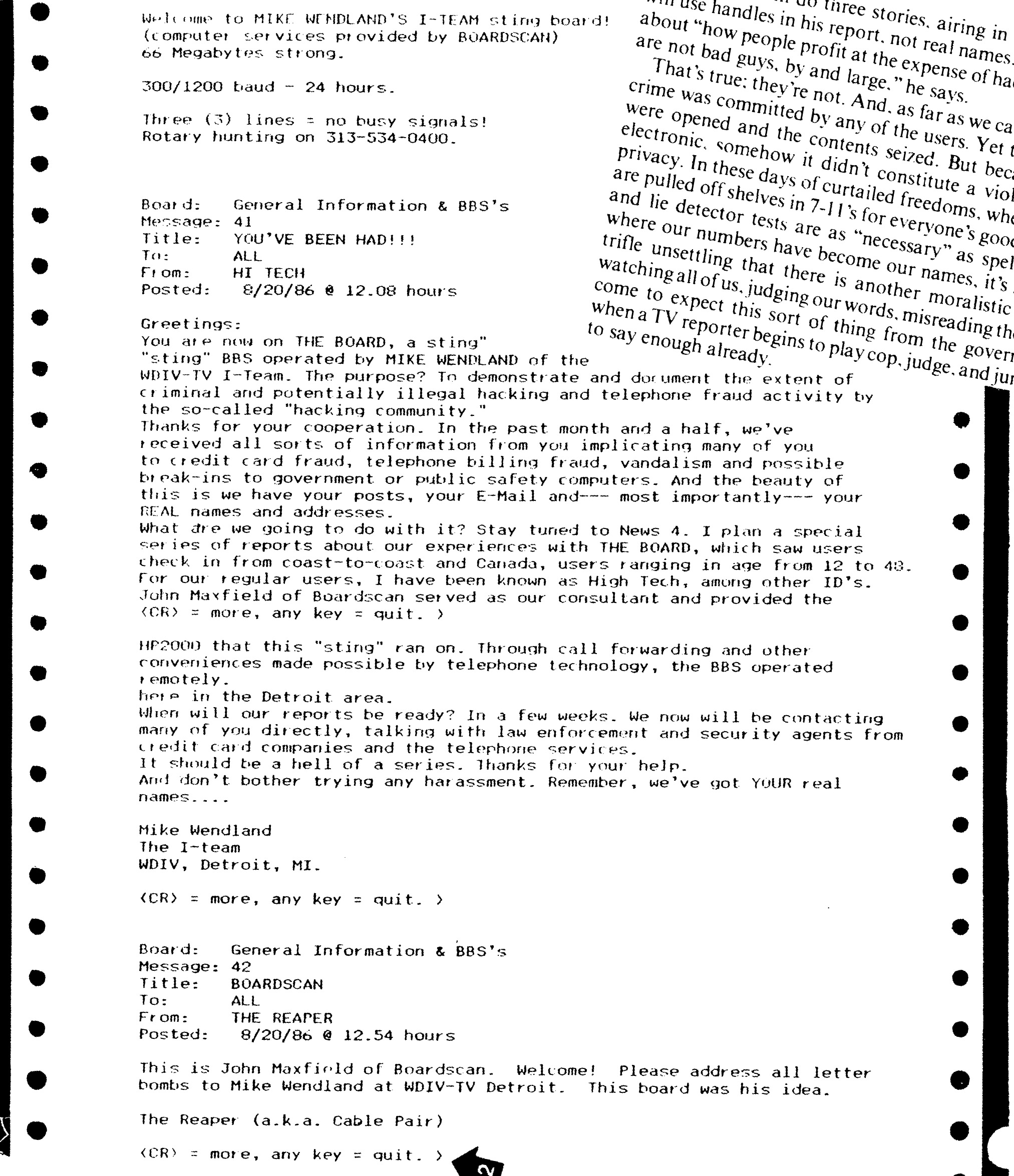 This time, though, it was different. This "sting" BBS was run by a TV station. Mike Wendland of WDIV-TV in Detroit thought the board would be a good way to get background fora story on hackers. So, for six weeks he operated a BBS on John Maxfield's HP 2000 minicomputer. Maxfield has been after hackers for years - both as an FBI informant (see page 1-6) and a private consultant.