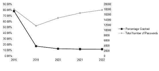 Fast-forward a few more years - I was dedicated to information security full-time. I got back to cracking. With the new password policy in place, a dedicated sysadmin team with management buy-in, and an unused account purge, I ended up only cracking about 17 percent of our 12,000 accounts. The trend continued with 13 percent of 15,000 accounts the next year (2020). The following year, we implemented cybersecurity training and made it mandatory for all users, and I ended up cracking about 12 percent of 17,000. Users are going to be users, and with tools like Pipal, it's easy to see the trends and terrible base-words that people use, so we add them to our password blacklist.