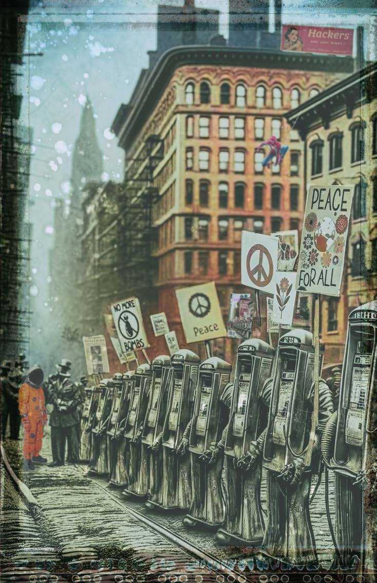An army of robot payphones is lined up, holding various signs calling for peace.