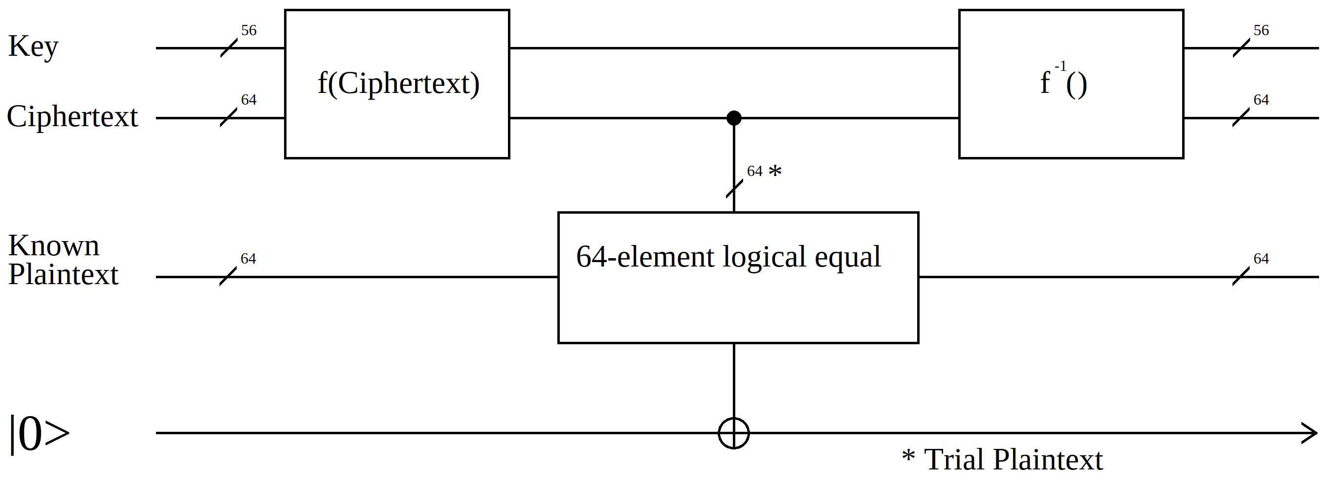 Note that the ciphertext and known plaintext are classical data, while the key, the trial plaintext, and the output are qubit data. If you provide a superposition as the key input, then the output will often be a superposition.