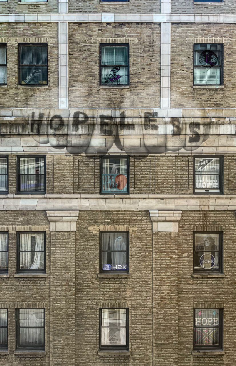 A couple of fists are superimposed on a photo of the hotel that have the word "HOPELESS" scrawled on their fingers.