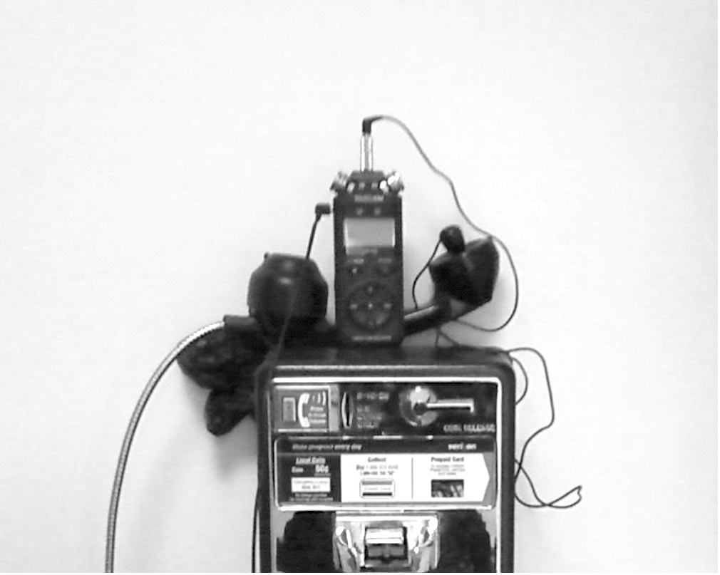 I needed to bypass the payphone to hear what was happening in the background, so I first went to the partially enclosed Verizon phone with the exposed line, which was a hybrid using a GSIII chassis.