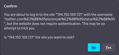 $ ./obfuscate_url.py Usage: ./obfuscate_url.py <fake_address> <real_ip_address> Example: ./url_schema_obfuscation.py twitter.com/elonmusk 194.150.169.131 $ ./obfuscate_url.py twitter.com/elonmusk 194.150.169.131 http://twitter.com∕elonmusk@3264653699 ^ UTF-8 ∕ | Not an ASCII '/' !!!!Be safe, and beware of links with an "@" sign!