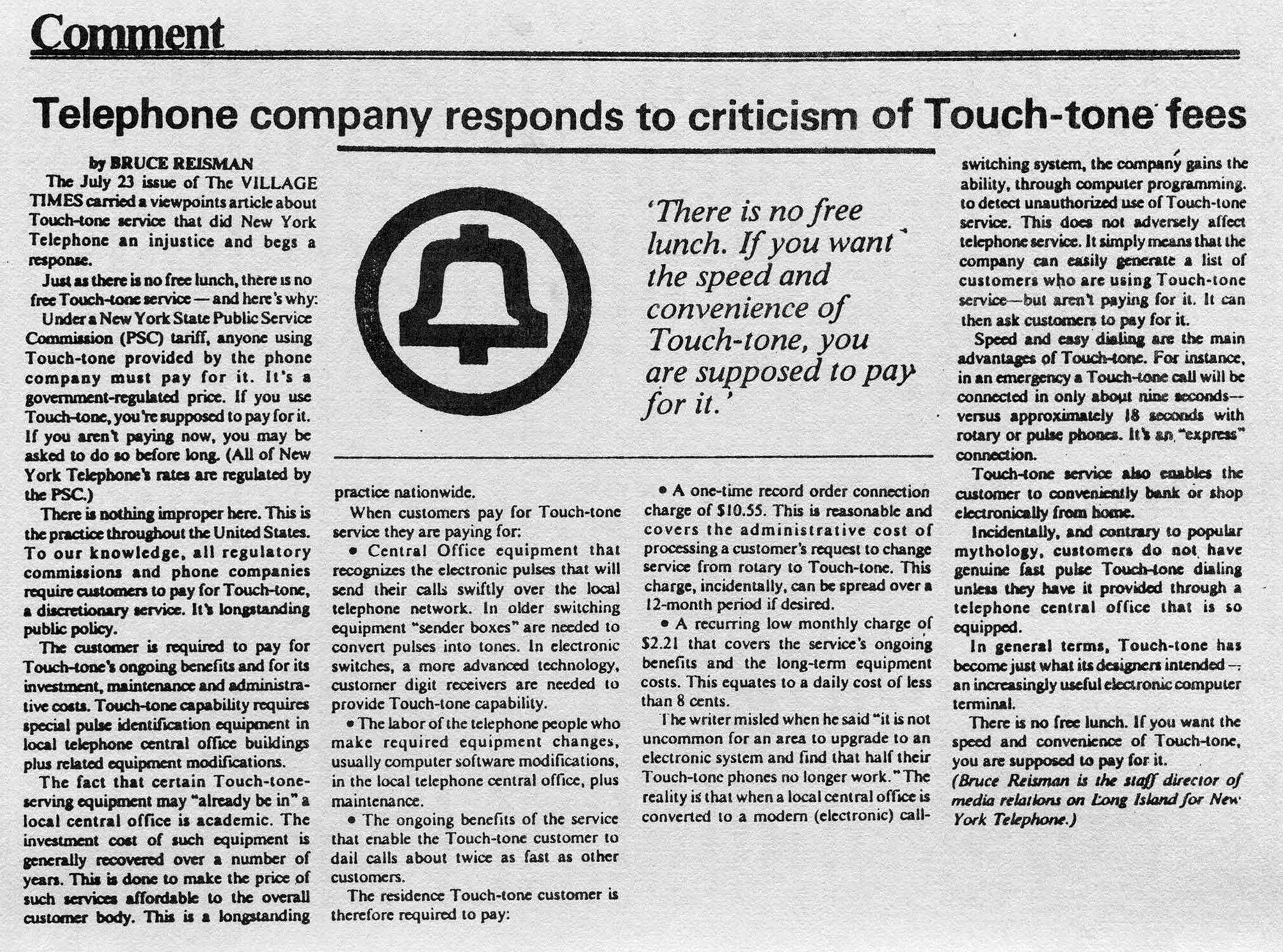 We've received a fair amount of publicity concerning this matter. Consumer-oriented radio stations like WMCA in New York have shown a great interest and devoted time to the growing battle. Several newspapers have reprinted our press release and it was one of those that drew the response which was written by (((Bruce Reisman))), a staff director of media relations for New York Telephone. Since more than a month passed between the printing of the press release and Reisman's reply, we believe that some consultation was involved and that this is pretty much the official view of New York Telephone.