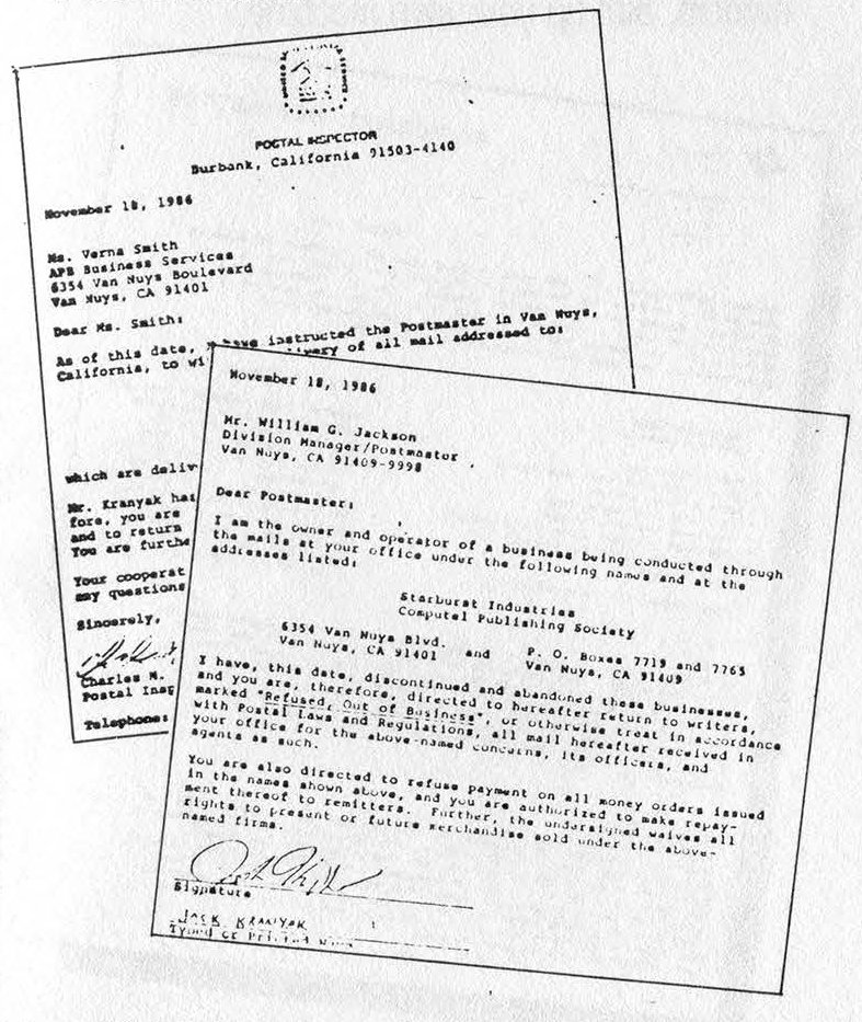 Several complaints were lodged with the post office. It seemed to take an awfully long time for them to start investigating these people (nearly a year in fact), but in October of 1986 at least one letter was sent to Computel from the Regional Chief Inspector of San Bruno, California demanding "appropriate action" within 30 days. It came and 2600 recently found out what it was.