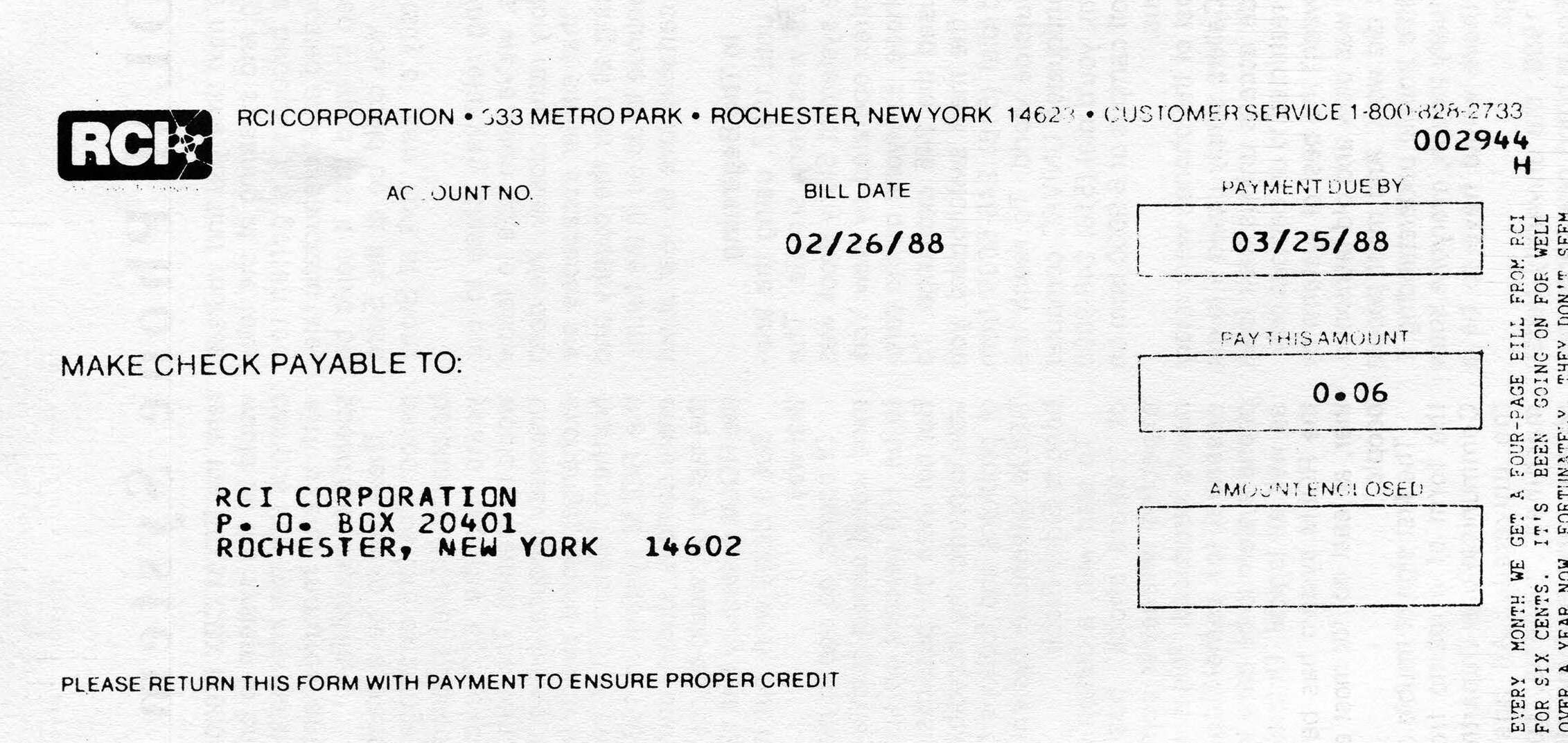 Every month we get a four-page bill from RCI for six cents.