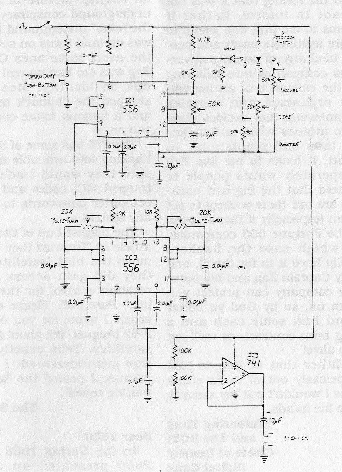 Semiconductors 2 556 Dual-Timer ICs 1 741 Op-Amp IC 1 1N914 Diodes Resistors 6 10 kΩ Resistors 1 4.7 kΩ Resistor 2 100 kΩ Resistors 4 50 kΩ PCB-Mount Potentiometer 2 20 kΩ Multi-Turn Potentiometer Capacitors 10 0.01 µF 1 1.0 µF Electrolytic 2 10 µF Electrolytic Miscellaneous 2 14-Pin DIP Socket 1 8-Pin DIP Socket 1 Momentary Push-Button Switch (N/O) 1 SPST Toggle Switch 1 Speaker or Telephone Earpiece Perf Board Box Mounting Hardware 9V Battery Clip
