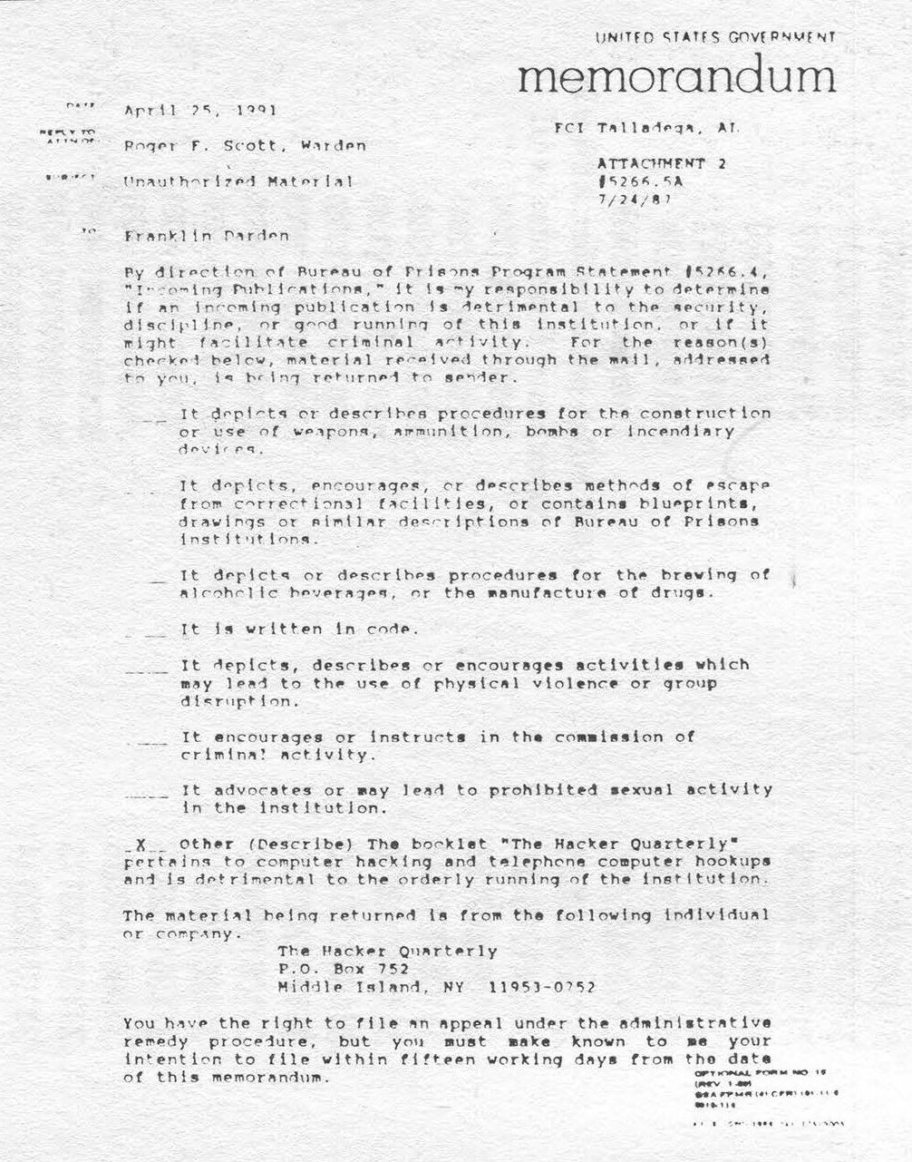"Well, here I sit. A prisoner of my own hobby. I'm currently being held in a Federal Prison Camp in Talladega, Alabama. I wish I could tell you that Prison Camp is not that bad. Sure, it's mot like the prison you see on TV, but it's really sucking. [The above is] what I received instead of 2600. Apparently your magazine poses a threat to the security of this institution. Let me also say that my hacking days are over. Also, I'd like to add, to any hackers out there, make sure you know what you're getting into. Consider the price you have to pay. Believe me, im my eyes it's not worth it. It was fun while it lasted. Play safe! The Leftist"