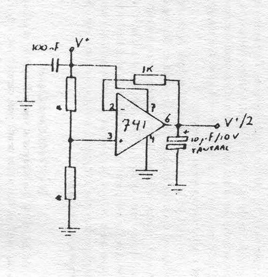 Most op-amps want to have a positive as well as a negative voltage. But by means of an active voltage divider (Schematic #5) we can supply the whole card reader from one 12 volt power supply. The active voltage divider is used twice in the reader/writer. First of all to divide the 12 volt down to 6 volts (in order to do this you put a 4.7 kΩ resistor where the asterisks are in the schematic). The second voltage divider you make by putting a 3.3 kΩ at that spot. This is done to divide the 5 volts out of you computer into 2.5 volts. The best thing to do is to place a relay on the write line going to the head. This is so as not to introduce noise while reading form the card.