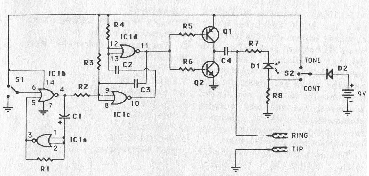 When S2 is in its center (OFF) position, the battery does not power the circuit at all. However, when the tone tracer is connected to a phone line, R7, D1, and R8 are connected across the phone line. Now the polarity of the line can be checked.