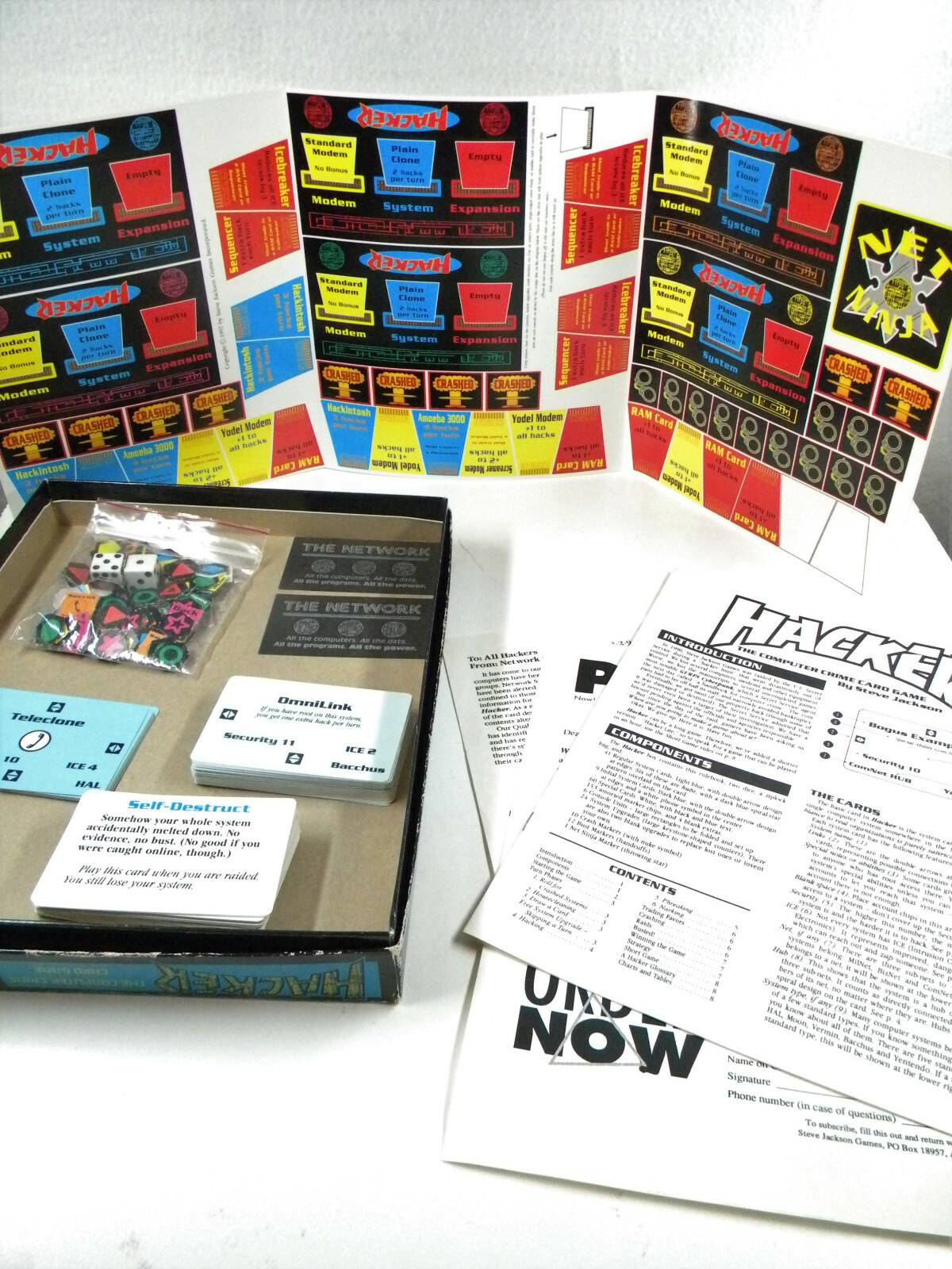 Hacker has all the elements of its namesake: players can hack, phreak, upgrade their computer equipment, crash systems, use secret in-dials, use back doors, travel on various networks, trade or coerce favors, nark on friends, raid or get raided (and possibly busted). The goal of the game is to be the first hacker to gain twelve or more active accounts. This number will vary depending on how long you wish to play. With five or six players, a typical game can last all night.