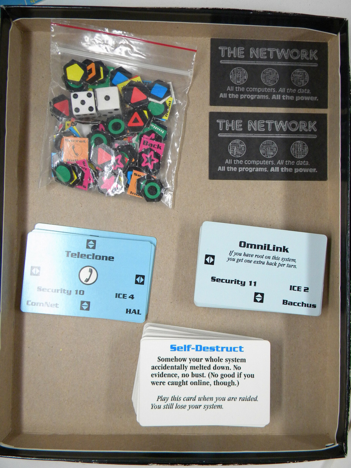 Those who are familiar with Illuminati will have no problem adapting to the look and feel of the game. The action takes place on an array of cards that, together, comprise the computer network. Each card represents an individual computer system complete with its own security and ICE levels, as well as networking information. Before the game begins, these "System" cards are dealt randomly to the players, who then proceed to "link" the cards together by laying them down on a flat surface next to each other. Players may arrange the cards in any way they see fit, although some rules exist to regulate this initial setting-up process. Some cards will only link in one direction, while other cards are multi-linkable.