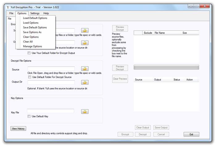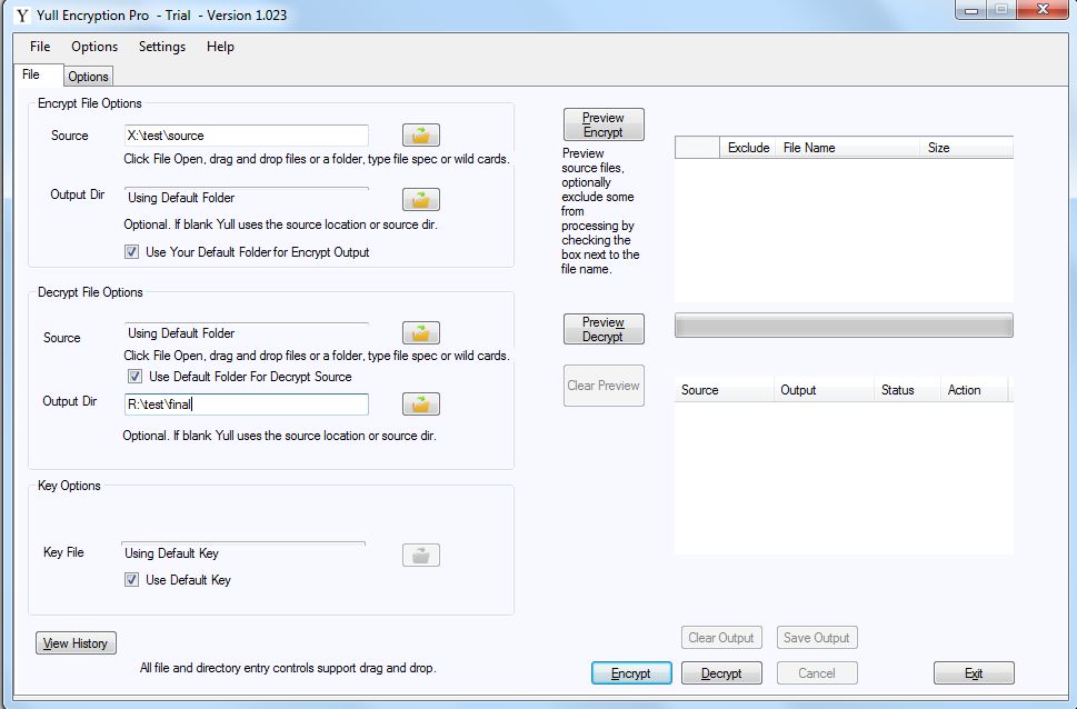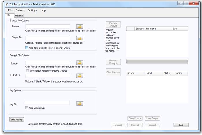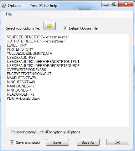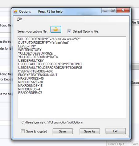 Regardless of whether you use YULL.EXE or YULLG.EXE, Yull needs at least to know the source file and its location, the output location and the key. You either supply Yull with the complete path to the source file and the complete path to the output folder (or file), or give YULL enough information to construct it on its own. There are various parameters which will help you do this. If no options are specified, YULL uses the default options which are those for the NORMAL encryption level. But the default options contain no path information.