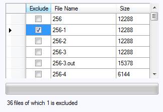 Here we've select the Default Folder as our destination for encryption and the default folder for decryption. There are 36 files in my source folder. If you have a lot of files in the source folder and only want to work with a few of them, you can sort them by the file name and size. You can also select one or more of the entire group by clicking on the square to the left of the name. With the column header at "Exclude" when you click on a file you see will the information about the group updated.