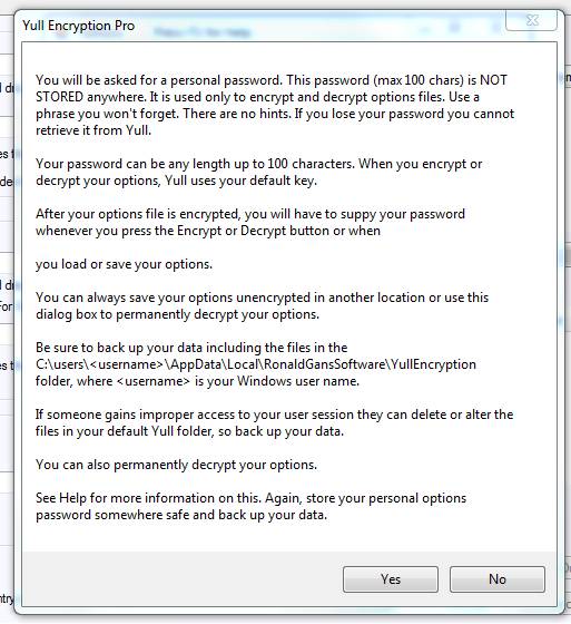 You can store your PDATA in the Options file and you can encrypt the options file as well. If you don't store the PDATA but still want to use it, check the ASK FOR PERSONAL DATA and when YULL encrypts or decrypts it will ask you for your PDATA. YULL will NOT validate your PDATA.