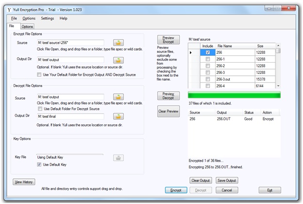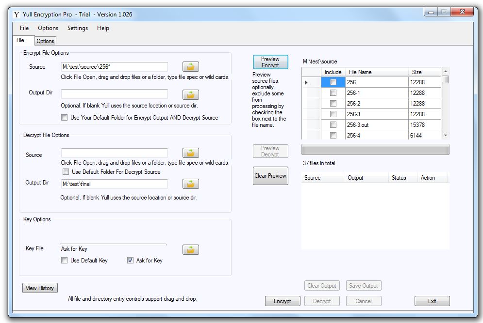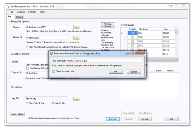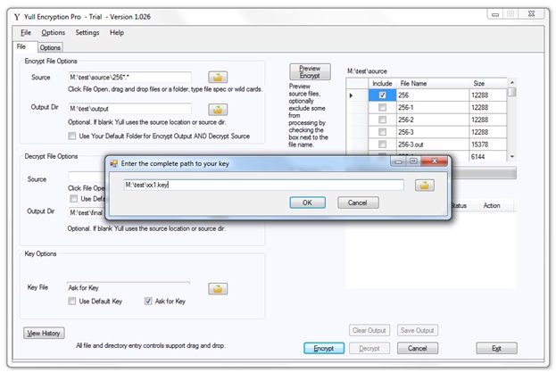 I've selected file 256 in M:\test\source folder. Yull is instructed to ask for the key file: