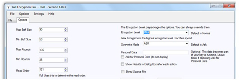 As you can see from the values in the Options Tab image, there are several "Buff" size and "Round" size controls. These control how big of a read buffer Yull will create, hence how many reads. The Rounds value helps determine how many rounds per read; that is, the number of times a read buffer is submitted to encryption. The buffer size and rounds cannot be determinedly set by the user. The values are suggestions, which Yull uses, in conjunction with the Level and key to create the actual values.