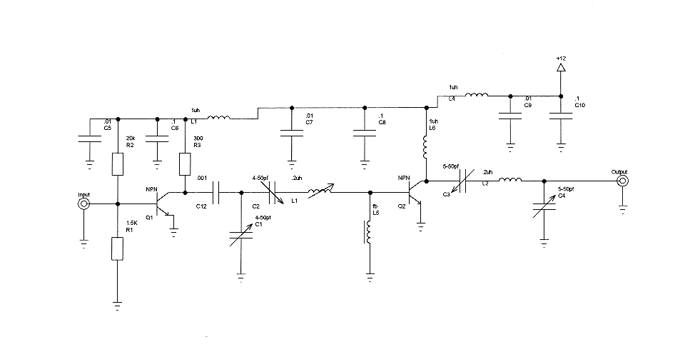 In the first stage the resistor R1 (1.5K) gives Q1 (mpf-901 or mrf-901) and the Ramsey transmitter a nice stable input/output load to look at that should smooth out missmatches between the transmitter and the amp (note that this type of matching is only workable at flea power levels.. < 50mw.) R2 (20K) provides the bias voltage making the amp class-A. Current is fed to the stage through R3 (300ohms) with a ferrite bead on the power side to help keep RF out of the power grid. An inductor of 1uh or better can be substituted if a ferrite bead cannot be found (use only small resistor type inductors, not giant monsters from Radio Shack). The first stage is isolated from the interstage maching circuit by C12 (.001).