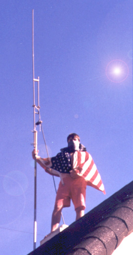 For an antenna, we used a halfwave horizontal di-pole, a center feed virtical di-pole, and a j-pole at different times depending on where the transmitter was living. We had our best coverage with our 1/2 wave horizontal (or close to horizontal) dipole that we had strung a good 150 feet up a couple of trees. With the other antennas they were no more than 30 feet above the ground. [Show above right is one of the only know pictures of G-Man in existance.]
