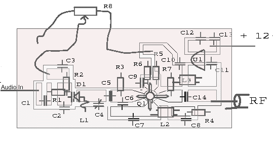 Q1 : BF900 D1 : BB405,BB102 or equal (most varicaps with C = 2-20 pF (approx) will do) U1 : uA78L08, uA7809, uA7810 or equal (MC78LXX, UC78LXX etc)