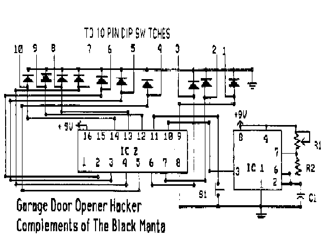 As you may notice, the schematics don't show how to connect directly to the garage door opener. What I do is this: First you must desolder the DIP switches from the door opener and solder an IC socket into where the DIP switches were. (This will allow you to put the DIPswitches back, when operating in normal mode.) Second, you should connect the output to a wirewrap IC socket. If you mount the IC socket on your pc or perfboard you can use the socket to plug right in to the door opener. When connecting the output, be sure that the connectionson the wirewrap socket correspond to the ON setting of the DIP switches.