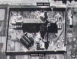 the prison at low altitude. Bottom Photo: The prison is smoking after the guards sleeping and eating areas have just been hit with bombs to generate confusion. As shown by the dark wall bricks that have been strewn across the white snow, two holes have been blown in the outer wall, one on the left and one on the right of the photo. Through these holes, hundreds of inmates escaped. |