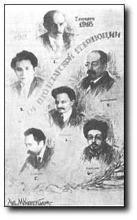 Trotsky's book, Stalin, written in exile, attempted to show that Stalin had played only an insignificant role in the early days of the Communist takeover. Trotsky attempted to illustrate this point by reproducing a postcard widely circulated in the months following the revolution. The postcard depicted the six leaders of the revolution. Shown are Lenin (who was at least one-quarter Jewish, spoke Yiddish in his home, and was married to a Jewess), Trotsky (real Jewish name: Lev Bronstein), Zinoviev (real Jewish name: Hirsch Apfelbaum), Lunacharsky (a Gentile), Kamenov (real Jewish name: Rosenfeld), and Sverdlov (Jewish).2 Not only does the postcard show the Jewish domination of the revolution; it also illustrates the fact the Jewish Communist leaders shown had changed their names just as reported in the Encyclopedia Judaica.