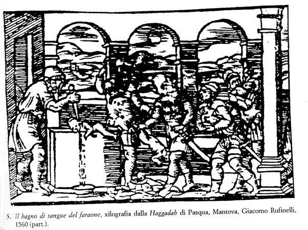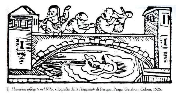 Probably in an attempt to detract from the overly obvious anti-Christian connotations of the ritual of the child’s crucifixion, Angelo da Verona transformed it into an emblematic commemoration of the epic tale of the exodus from Egypt, explicitly linking it to the celebration of the Pesach. The wound inflicted on the victim’s jaw was said to have been required to recall Moses’ useless appeals to the Pharaoh