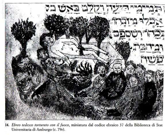 14. German Jew Tortured with Fire, miniature from Jewish Code 37 from the Hamburg State and University Library (c. 79r)