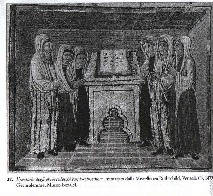 13. "lnterrogatus ubi erant mulieres ipsorum ludeorum, respondit quod non erant in sinagoga, quia non est de more eorum quod mulieres intrant sinagogam. Interrogatus ubi stant mulieres quando celebrantur offitia sua, respondit quod mulieres tunc stant in camera que est ante sinagogam. Interrogatus an mulieres stantes in dicta camera possint videre in sinagogam et maxime ea que sunt super almemore, respondit quod non, nisi veniant super ostium per quod intratur in sinagogam. Et dicit, interrogatus, quod secundum eorum consuetudinem mulieres, que se reperiunt in camera que est ante sinagogam, se reducunt super ostium quando elevantur precepta Moisi in sinagoga. Et dicit, interrogatus, quod dieta die Sabbati de sero precepta deberunt elevati, quia omni die Sabbato de sero elevantur, secundum eorum ordines" (cfr. A. Esposito e D. Quaglioni, Processi contro gli ebrei di Trento, 1475-1478. I: I processi del 1475, Padova, 1990, pp. 324- 325).