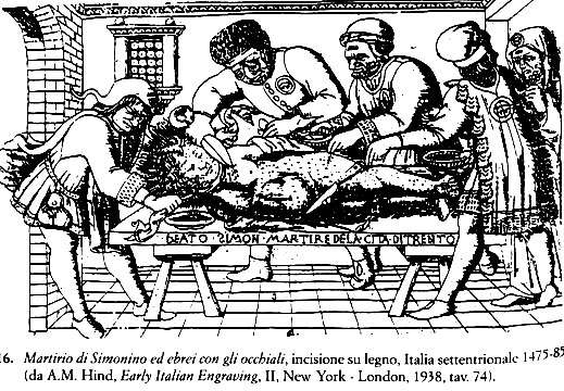 16. Martyrdom of Simonino and Jews with Eyeglasses, woodcut, Northern Italy 1475-85 (from A.M. Hind, Early Italian Engraving, II, New York-London, 1938, table 74