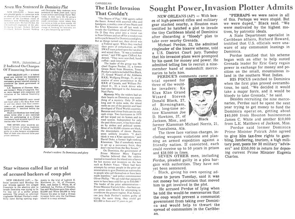 You've all read of the arrests in New Orleans made in connection with the projected plan involving the island of Dominica in the Caribbean Sea . I must comment at the start of this that a D-Day on the part of the Ku Klux Klan is a long way from burning crosses in cow pastures. That is encouraging enough right there. But because it was a first, infant step, it failed. It failed however for reasons easily corrected. It was a good idea and it was not bound to fail. Loose lips sink ships, always did and always will. I'm not trying to pick apart a mission that failed for reasons either inside or outside but I am wondering about something that could have still happened but did not.