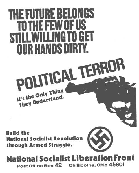 One incontrovertible fact is that the NSLF remains to date the only new development within the Movement in America since Rockwell began it in 1958. It was Joseph Tommasi's work of the most incredible genius, the POLITICAL TERROR leaflet, that he designed in 1974 and which reached my hands at that time, that provided for those true revolutionaries in the NS Movement what we had been groping towards for years. It was original and unique and Tommasi had DONE IT! NSLF is not an order of monks sequestered away studying religious tracts and further separating ourselves from reality. We do not wish to get the tiniest handful thinking differently nor do we imagine we can do the same with the masses. We do wish to give the answers to the people that are as plain as the noses on their faces. We preach revolution while the rest preach reaction. We do not wish to rock the boat, we intend to SINK IT!