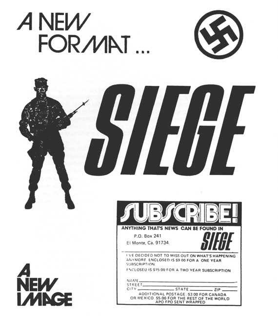 Recall the cornerstone of the U.S. Nazi Movement's "grand strategy" of the Sixties? Rings crazy as hell today in light of developments over the past ten or fifteen years. It involved depending upon and even HELPING the Pigs against the urban revolutionaries!! We'd be absolute idiots to attack the Pigs ourselves in any attempt to initiate something of the nature of a general rebellion.