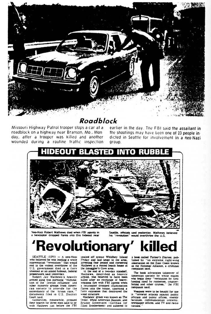 Much has transpired which has been printed in the System media. Nothing quite like this has happened before. The System is reacting with full vigor, with the full force of its Pig Machine. But men of The Order, as they call themselves, are still standing in defiance or remaining at liberty.