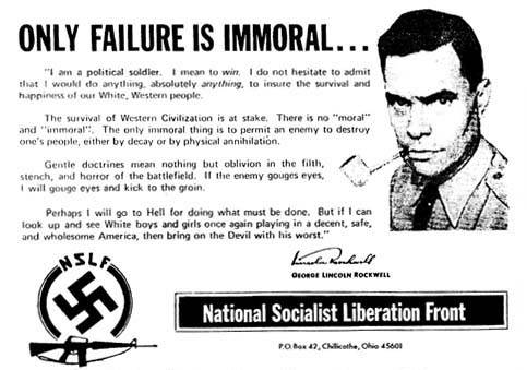 Again, life is simple to the fanatic. Commander Rockwell said that, "ONLY FAILURE IS IMMORAL." Anyone could expand that to mean that anything not contributory to ultimate success of the Revolution is immoral. You live, you breathe, you wake, you sleep for the Movement, for Revolution. You live as though an all-seeing eye is watching and will one day pass Judgment. And you make damned sure that you won't be counted among those others, not even by accident.