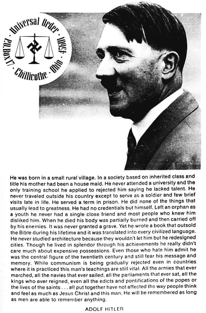 Hindsight alone is more dangerous than it is useless. Are we to say it can't happen again in a totally unpredictable way? Do any among us still seriously think we can do it alone, using the past and current methods, without some new, difference-making input? I quote from Hitler: "I know that some man capable of giving our problems a final solution must appear.. And that is why I have set myself to do the preparatory work, for I know that I am myself not the one. And I know also what is missing in me (to be the one). But the other one still remains aloof, and nobody comes forward, and there is no more time to be lost." That was a statement made by Hitler in 1928. In 1924, in Mein Kampf, as all National Socialists must be aware, Hitler also said this: "THE MAN THEY HAVE MOST REVILED STANDS CLOSEST TO US, AND THE MAN THEY HATE WORST IS OUR BEST FRIEND."