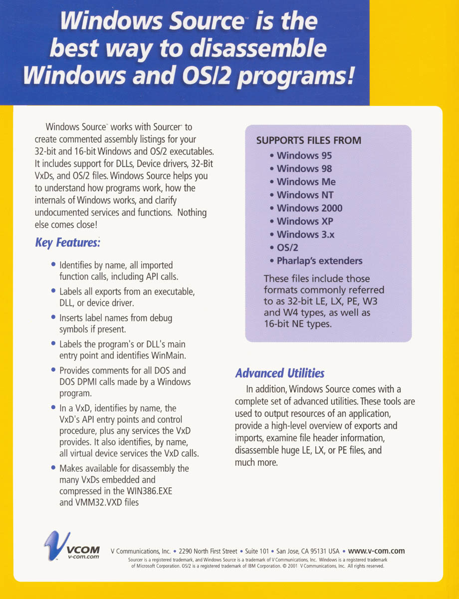 Windows Source version 8 works with V Communications' Sourcer, version 8.00 and later, to produce commented disassemblies of Windows 16 & 32 bit executables, dynamic link libraries (DLLs), device drivers, and 32-bit virtual device drivers (VxDs). The generated assembly listings are primarily used to improve your understanding of Windows programs, the internals of Windows itself, and help identify and clarify important undocumented services and functions. It should be noted that it will not be immediately practical to re-assemble the outputs.