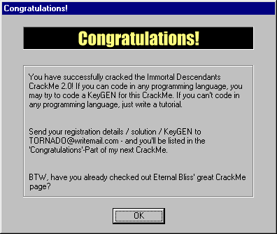 | Target Program: | TORN@DO´s ID CRACK ME 2.0 | | Description: | TORN@DO´s ID CRACK ME 2.0 is a little program on which you can try your skillz! | | Protection: | Registration Code | | Tools needed: | SoftICE 3.24, W32Dasm 8.9 | | Ob duh: | Do I really have to remind you all that by BUYING and NOT stealing the software you use will ensure that these software houses will continue to produce even *better* software for us to use and more importantly, to continue offering even more challenges to breaking their often weak protection systems. BTW, It's illegal to use cracked Software! If you're looking for cracks or serial numbers from these pages then your wasting your time, try to search elsewhere on the Web under Warez, Cracks, etc. | | Info: | Brand and product names are trademarks or registered trademarks of their respective holders. | | Notes: | - My$ticL has written this tutorial on 27th January 1999. - Tutorial slightly edited by TORN@DO. | | Level: | (X)Beginner ( )Intermediate ( )Advanced ( )Expert | |