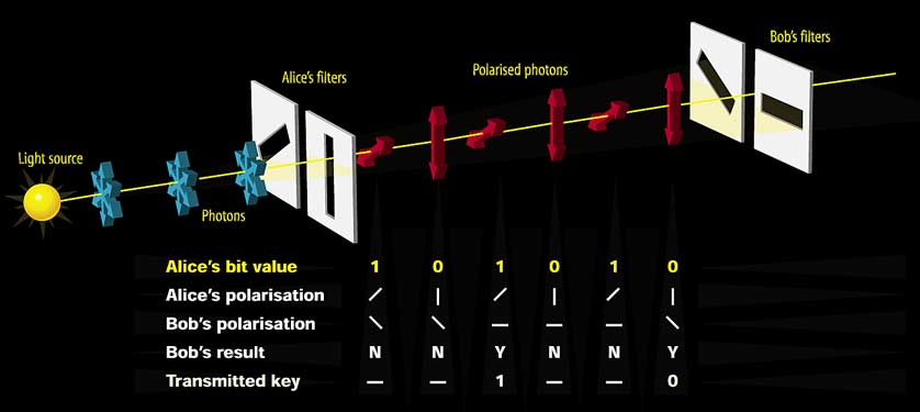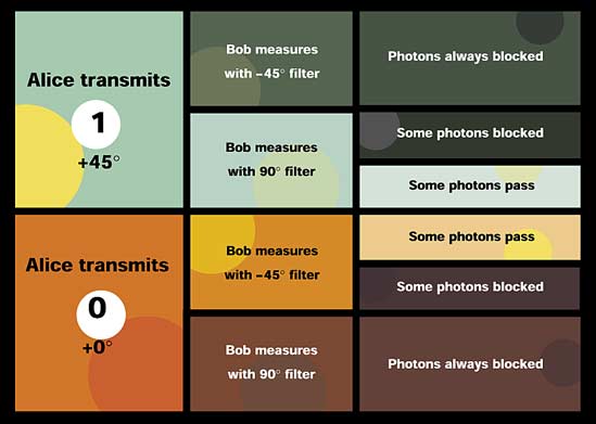 Graphics: Quantum cryptography: Photon transmission (A) Photons that pass through Bob's 90 degree and -45 degree filters must have started off as 1 and 0 respectively Quantum cryptography: Photon transmission (B) Bob swaps randomly between his filters to measure the photons sent by Alice. Many are blocked, but the ones that pass through form the key. |