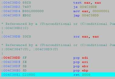 We've got test eax, eax , then je and mov eax, 00000001. We need that. Click je 004C38DB and read offset.